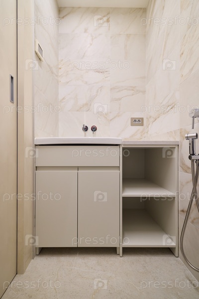Современная зона раковины в ванной комнате с элегантным туалетным столиком и вместительными полками