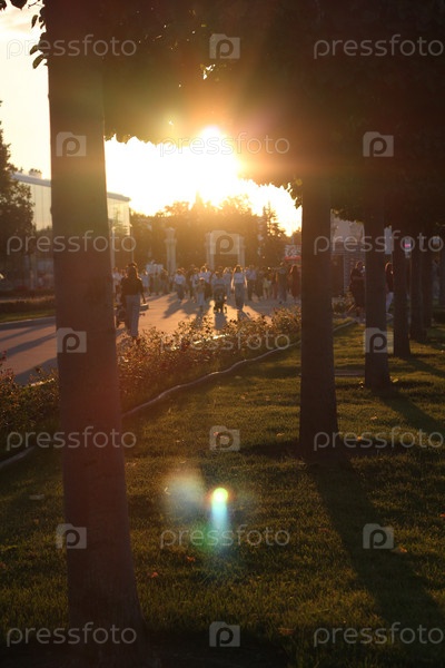 Красивое сияние заката можно увидеть за силуэтами деревьев в городской среде