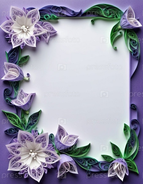 Бумажные цветы, изготовленные в технике квиллинга. Цветы в оттенках фиолетового, лавандового, сиреневого и белого цветов, расположены на фоне кругового узора. Рамка с местом для копирования. Сгенерировано с помощью ИИ