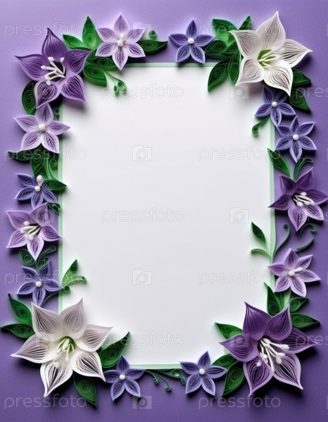 Бумажные цветы, изготовленные в технике квиллинга. Цветы в оттенках фиолетового, лавандового, сиреневого и белого цветов, расположены на фоне кругового узора. Рамка с местом для копирования. Сгенерировано с помощью ИИ