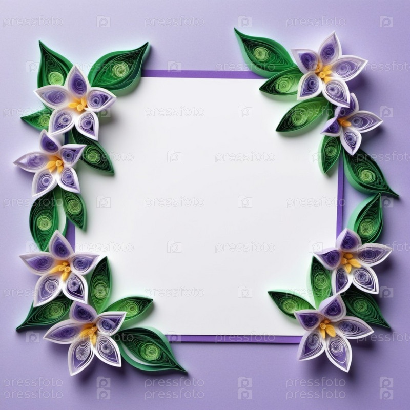 Бумажные цветы, выполненные в технике квиллинга. Цветы в оттенках фиолетового, лавандового, сиреневого и белого цветов, расположены на фоне кругового узора. Рамка с местом для копирования. Сгенерировано с помощью ИИ