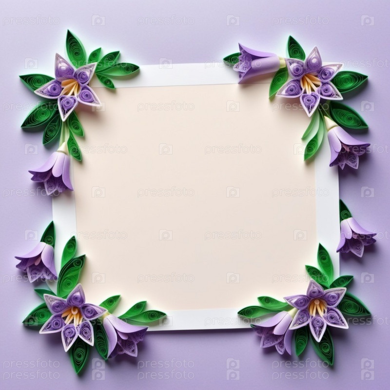 Бумажные цветы, выполненные в технике квиллинга. Цветы в оттенках фиолетового, лавандового, сиреневого и белого цветов, расположены на фоне кругового узора. Рамка с местом для копирования. Сгенерировано с помощью ИИ