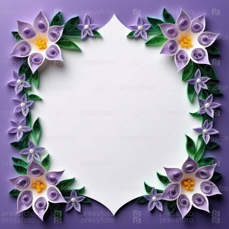 Бумажные цветы, выполненные в технике квиллинга. Цветы в оттенках фиолетового, лавандового, сиреневого и белого цветов, расположены на фоне кругового узора. Рамка с местом для копирования. Сгенерировано с помощью ИИ