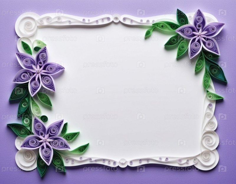 Бумажные цветы, выполненные в технике квиллинга. Цветы в оттенках фиолетового, лавандового, сиреневого и белого цветов, расположены на фоне кругового узора. Рамка с местом для копирования. Сгенерировано с помощью ИИ