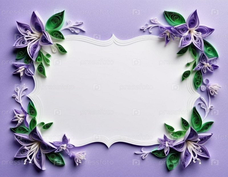 Бумажные цветы, выполненные в технике квиллинга. Цветы в оттенках фиолетового, лавандового, сиреневого и белого цветов, расположены на фоне кругового узора. Рамка с местом для копирования. Сгенерировано с помощью ИИ