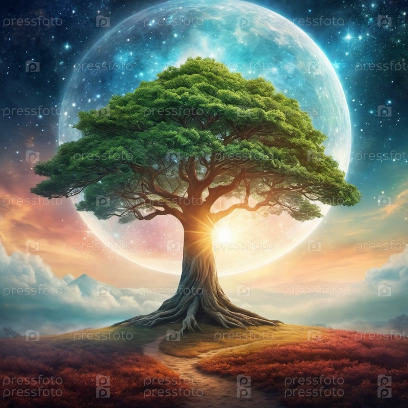 Одинокое дерево возвышается на фоне полной луны и звездного ночного неба. Ветви деревьев тянутся к небесам. Луна бросает теплое, эфирное сияние на ландшафт, создавая ощущение тайны и чуда