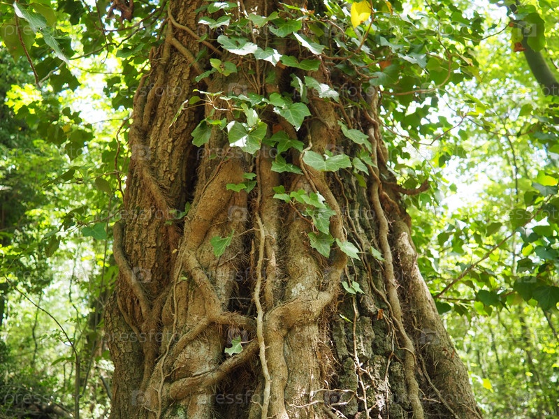 Лианы на ветвях деревьев в европейском лесу. Сербия, национальный парк Фрушка-Гора. Растение, которое находит вертикальную опору. Усики, придаточные корни, прикрепления. Лиана — жизненная форма растений