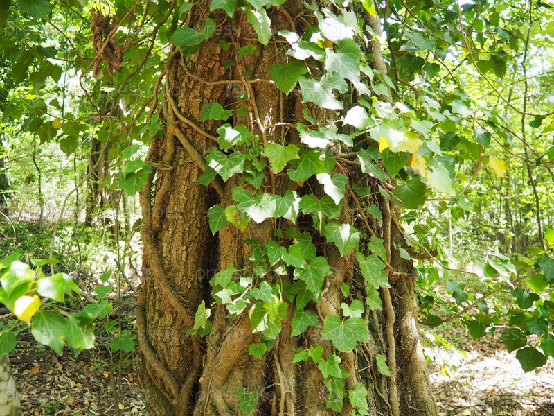 Лианы на ветвях деревьев в европейском лесу. Сербия, национальный парк Фрушка-Гора. Растение, которое находит вертикальную опору. Усики, придаточные корни, прикрепления. Лиана — жизненная форма растений