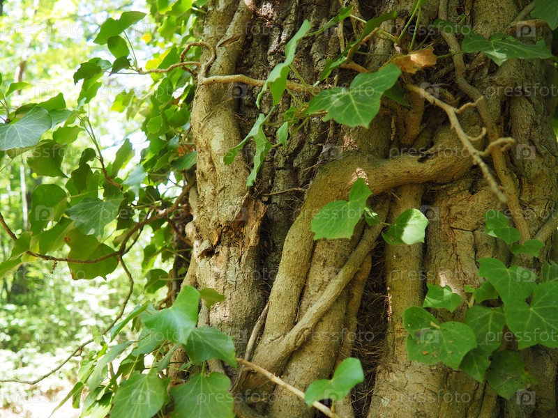 Лианы на ветвях деревьев в европейском лесу. Сербия, национальный парк Фрушка-Гора. Растение, которое находит вертикальную опору. Усики, придаточные корни, прикрепления. Лиана — жизненная форма растений