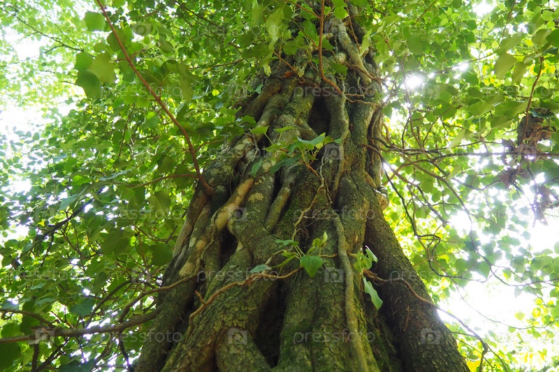 Лианы на ветвях деревьев в европейском лесу. Сербия, национальный парк Фрушка-Гора. Растение, которое находит вертикальную опору. Усики, придаточные корни, прикрепления. Лиана — жизненная форма растений