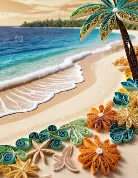 Спокойная пляжная сцена с мягкими волнами, песчаным берегом и пальмами, отбрасывающими тени. Яркие цвета и мягкие мазки создают умиротворяющую атмосферу. Сгенерированный ИИ. Путешествия на солнечном пляже