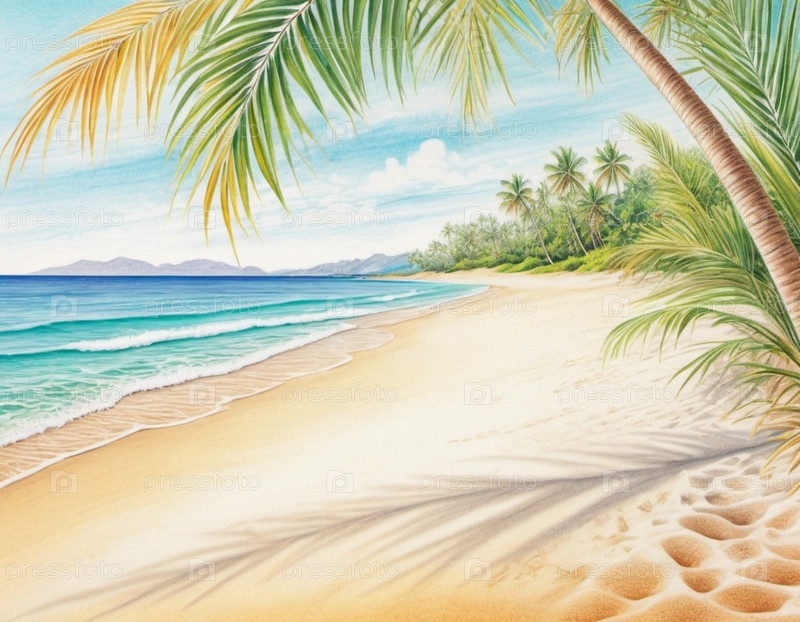 Спокойная пляжная сцена с мягкими волнами, песчаным берегом и пальмами, отбрасывающими тени. Яркие цвета и мягкие мазки создают умиротворяющую атмосферу. Сгенерированный ИИ. Солнечный пляж, отпуск, путешествия