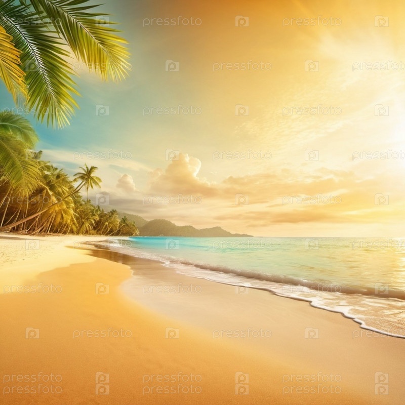 Спокойная пляжная сцена с мягкими волнами, песчаным берегом и пальмами, отбрасывающими тени. Яркие цвета и мягкие мазки создают умиротворяющую атмосферу. Сгенерированный ИИ. Путешествия на солнечном пляже