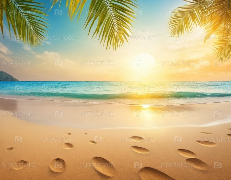 Спокойная пляжная сцена с мягкими волнами, песчаным берегом и пальмами, отбрасывающими тени. Яркие цвета и мягкие мазки создают умиротворяющую атмосферу. Сгенерированный ИИ. Путешествия на солнечном пляже