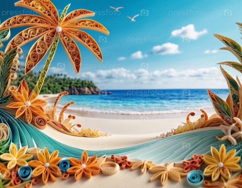 Спокойная пляжная сцена с мягкими волнами, песчаным берегом и пальмами, отбрасывающими тени. Яркие цвета и мягкие мазки создают умиротворяющую атмосферу. Сгенерированный ИИ. Путешествия на солнечном пляже