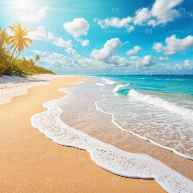 Художественная пляжная сцена с мягкими волнами, песчаным берегом. Яркие цвета создают умиротворяющую атмосферу. Сгенерированный ИИ. Концепция путешествия на солнечном пляже. Копировать пространство. Солнечный тропический рай. Фон пляжа