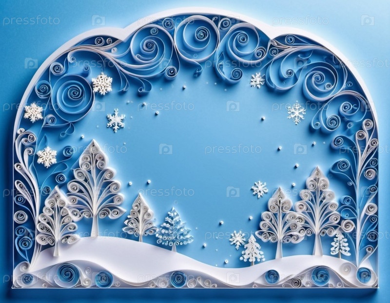 Крупный план бумажной работы в технике квиллинга, изображающей зимнюю сцену. Работа представляет собой завитки из белой бумаги, расположенные так, чтобы сформировать снежный пейзаж с деревьями и декоративной аркой из снежинок. Копировальное пространство.
