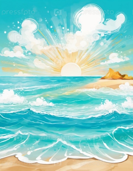 Художественная пляжная сцена с мягкими волнами, песчаным берегом. Яркие цвета создают умиротворяющую атмосферу. Сгенерированный ИИ. Концепция путешествия на солнечном пляже. Копировать пространство. Солнечный тропический рай. Фон пляжа