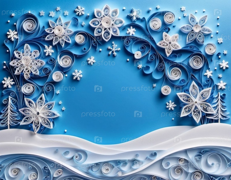 Крупный план бумажной работы в технике квиллинга, изображающей зимнюю сцену. Работа представляет собой завитки из белой бумаги, расположенные так, чтобы сформировать снежный пейзаж с деревьями и декоративной аркой из снежинок. Копировальное пространство.