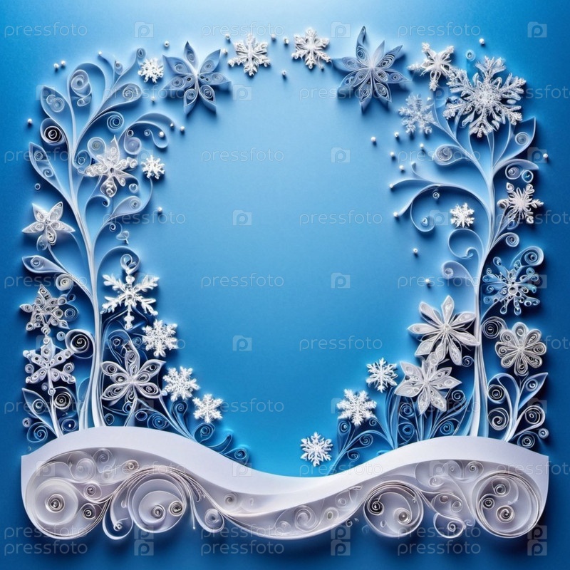 Крупный план бумажной работы в технике квиллинга, изображающей зимнюю сцену. Работа представляет собой завитки из белой бумаги, расположенные так, чтобы сформировать снежный пейзаж с деревьями и декоративной аркой из снежинок. Копировальное пространство.
