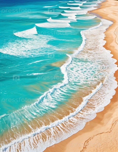Художественная пляжная сцена с мягкими волнами, песчаным берегом. Яркие цвета создают умиротворяющую атмосферу. Сгенерированный ИИ. Концепция путешествия на солнечном пляже. Копировать пространство. Солнечный тропический рай. Фон пляжа
