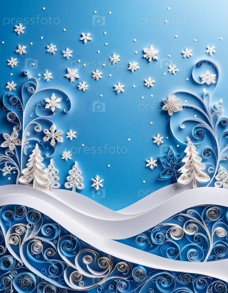 Крупный план бумажной работы в технике квиллинга, изображающей зимнюю сцену. Работа представляет собой завитки из белой бумаги, расположенные так, чтобы сформировать снежный пейзаж с деревьями и декоративной аркой из снежинок. Копировальное пространство.