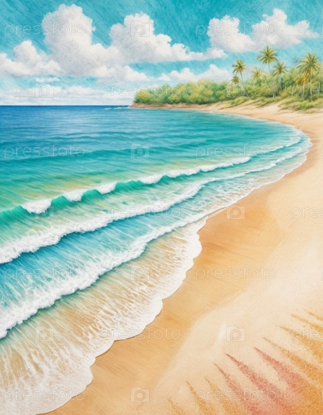 Художественная пляжная сцена с мягкими волнами, песчаным берегом. Яркие цвета создают умиротворяющую атмосферу. Сгенерированный ИИ. Концепция путешествия на солнечном пляже. Копировать пространство. Солнечный тропический рай. Фон пляжа