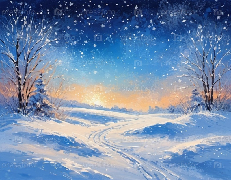 Рождественский закатный пейзаж, покрытый белым снегом. Чудесный зимний лес. Новогодняя рождественская атмосфера. Праздничная и очаровательная зимняя страна чудес. Снежинки, сугробы и холмы. Сгенерировано ИИ