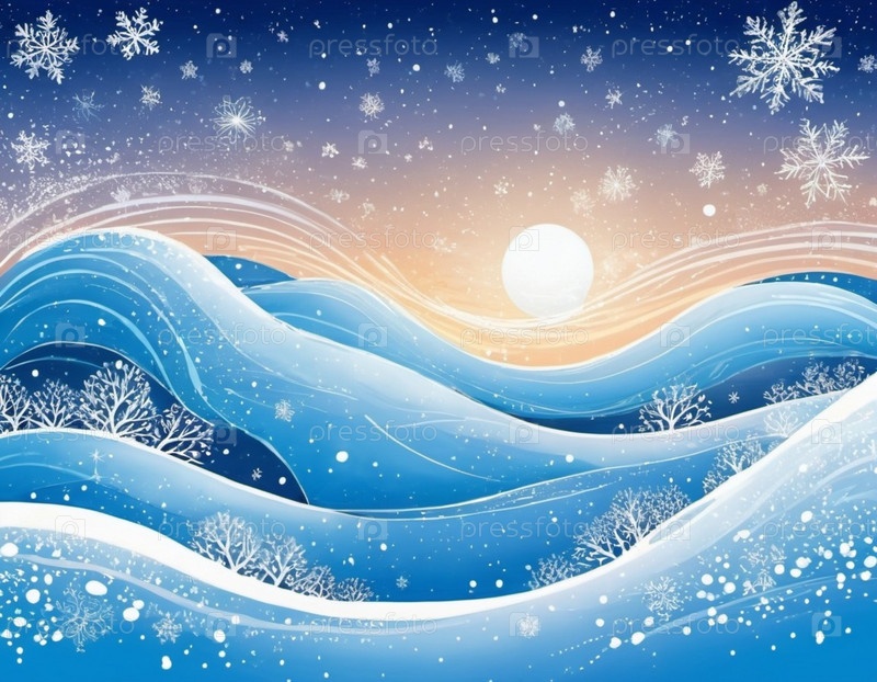 Рождественский закатный пейзаж, покрытый белым снегом. Чудесный зимний лес. Новогодняя рождественская атмосфера. Праздничная и очаровательная зимняя страна чудес. Снежинки, сугробы и холмы. Сгенерировано ИИ