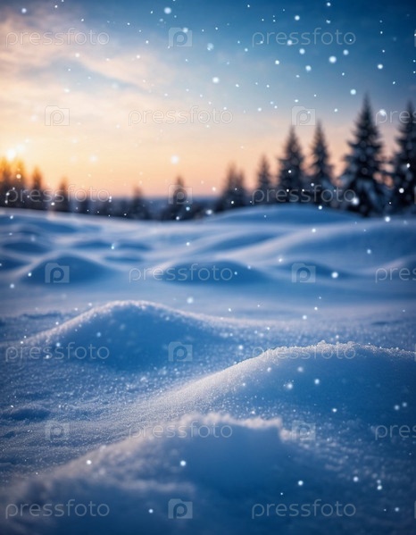 Рождественский закатный пейзаж, покрытый белым снегом. Чудесный зимний лес. Новогодняя рождественская атмосфера. Праздничная и очаровательная зимняя страна чудес. Снежинки, сугробы и холмы. Сгенерировано ИИ