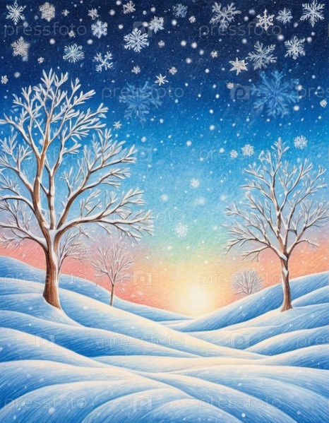 Рождественский закатный пейзаж, покрытый белым снегом. Чудесный зимний лес. Новогодняя рождественская атмосфера. Праздничная и очаровательная зимняя страна чудес. Снежинки, сугробы и холмы. Сгенерировано ИИ