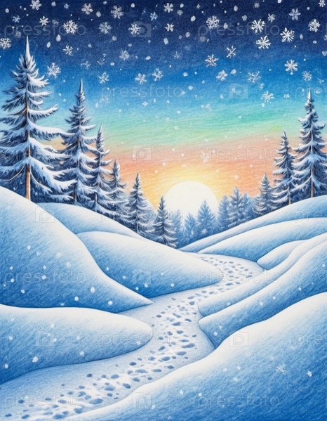 Рождественский закатный пейзаж, покрытый белым снегом. Чудесный зимний лес. Новогодняя рождественская атмосфера. Праздничная и очаровательная зимняя страна чудес. Снежинки, сугробы и холмы. Сгенерировано ИИ