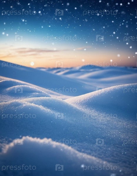 Рождественский закатный пейзаж, покрытый белым снегом. Чудесный зимний лес. Новогодняя рождественская атмосфера. Праздничная и очаровательная зимняя страна чудес. Снежинки, сугробы и холмы. Сгенерировано ИИ