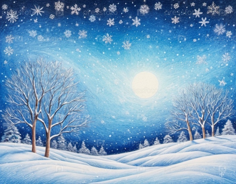 Лунный рождественский пейзаж, покрытый свежим белым снегом. Чудесный зимний лес. Новогодняя рождественская атмосфера. Праздничная и очаровательная зимняя страна чудес. Снежинки, сугробы и холм. Сгенерировано ИИ