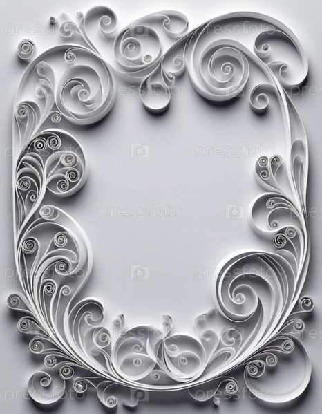 Бумажные цветы, выполненные в технике квиллинг. Цветы в оттенках серого и белого, расположены по кругу на сером фоне. Рамка с местом для копирования. Сгенерировано с помощью ИИ