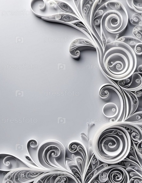 Бумажные цветы, выполненные в технике квиллинг. Цветы в оттенках серого и белого, расположены по кругу на сером фоне. Рамка с местом для копирования. Сгенерировано с помощью ИИ