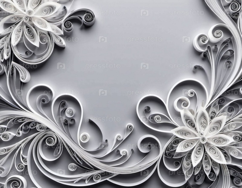 Бумажные цветы, выполненные в технике квиллинг. Цветы в оттенках серого и белого, расположены по кругу на сером фоне. Рамка с местом для копирования. Сгенерировано с помощью ИИ