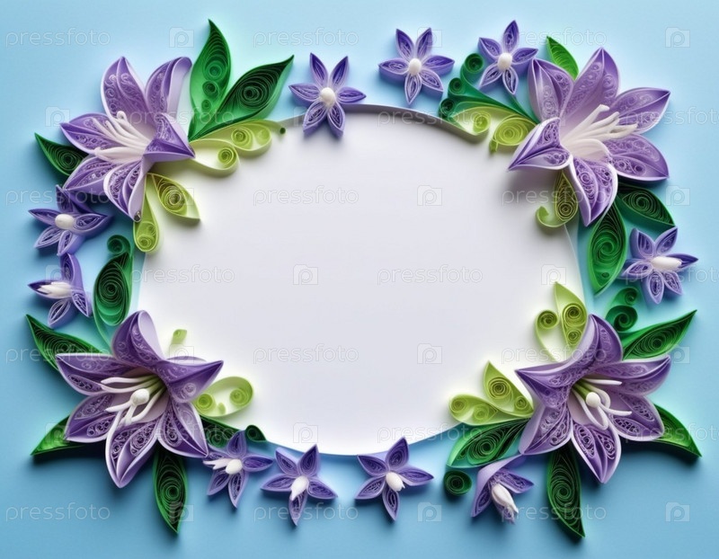 Бумажные цветы, выполненные в технике квиллинга. Цветы в оттенках фиолетового, лавандового, сиреневого и белого цветов, расположены на фоне кругового узора. Рамка с местом для копирования. Сгенерировано с помощью ИИ