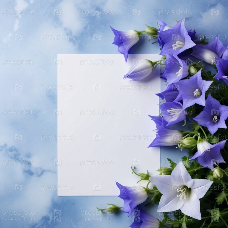 Чистый лист бумаги, окруженный рамкой из фиолетовых или синих колокольчиков. Цветы, расположенные вокруг бумаги, создают естественную красивую границу. Фон или шаблон для различных целей, пространство для копирования