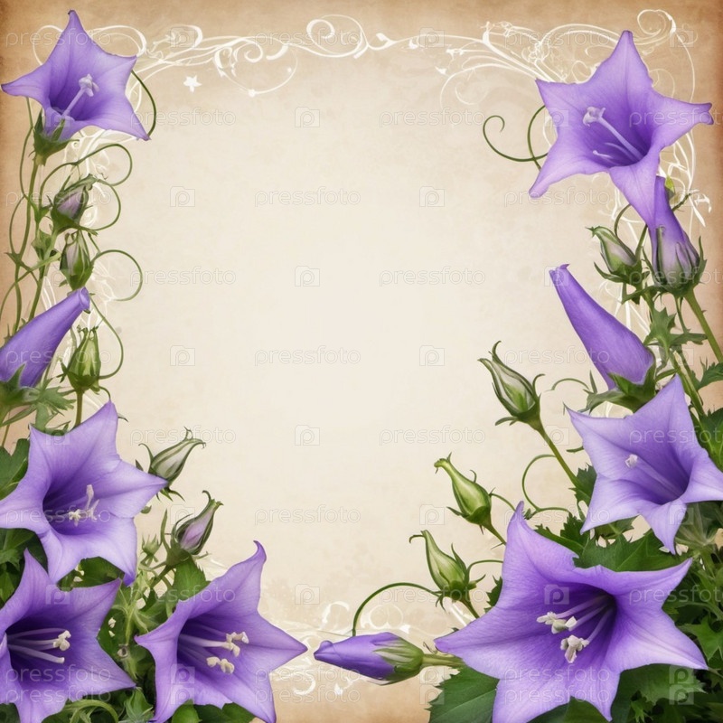 Чистый лист бумаги, окруженный рамкой из фиолетовых или синих колокольчиков. Цветы, расположенные вокруг бумаги, создают естественную красивую границу. Фон или шаблон для различных целей, пространство для копирования