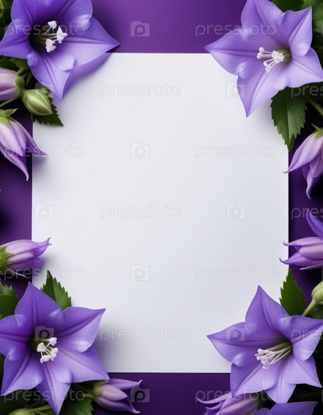 Чистый лист бумаги, окруженный рамкой из фиолетовых или синих колокольчиков. Цветы, расположенные вокруг бумаги, создают естественную красивую границу. Фон или шаблон для различных целей, пространство для копирования