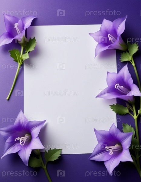 Чистый лист бумаги, окруженный рамкой из фиолетовых или синих колокольчиков. Цветы, расположенные вокруг бумаги, создают естественную красивую границу. Фон или шаблон для различных целей, пространство для копирования