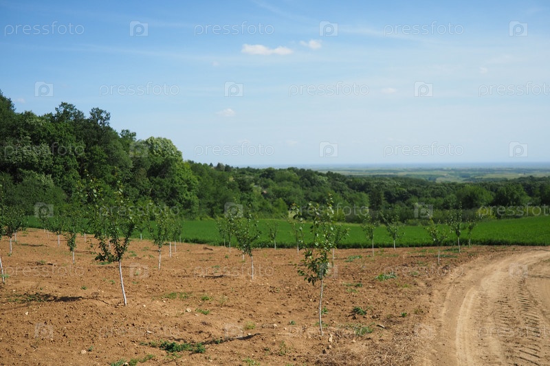 Саженец яблони высаживается в садовую землю весной, в яму. Сезон посадки деревьев. Вспаханное поле на Фрушка-Гора, Сербия, Национальный парк
