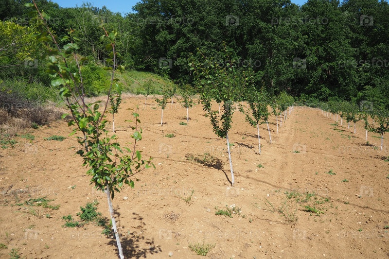 Саженец яблони высаживается в садовую землю весной, в яму. Сезон посадки деревьев. Вспаханное поле на Фрушка-Гора, Сербия, Национальный парк