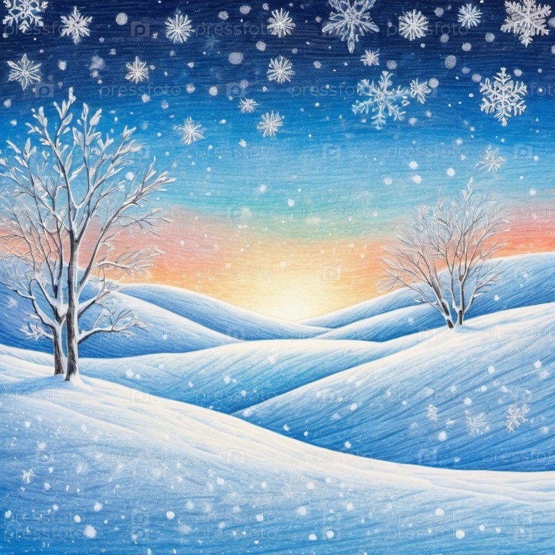 Живописная зимняя сцена с заснеженной равниной и силуэтами деревьев на фоне яркого ночного неба. Мягкий снегопад добавляет волшебный штрих, создавая спокойный и захватывающий дух пейзаж. Сгенерированный ИИ