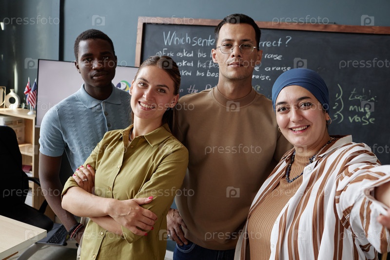 Сельфи четырех преподавателей английского языка, улыбающихся на камеру в школьном классе