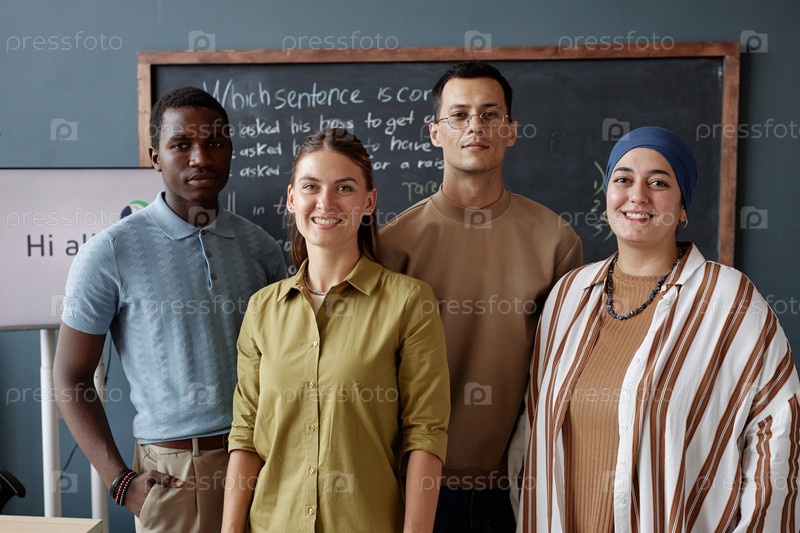 Группа преподавателей английского языка и студентов, улыбающихся на камеру в школьном классе