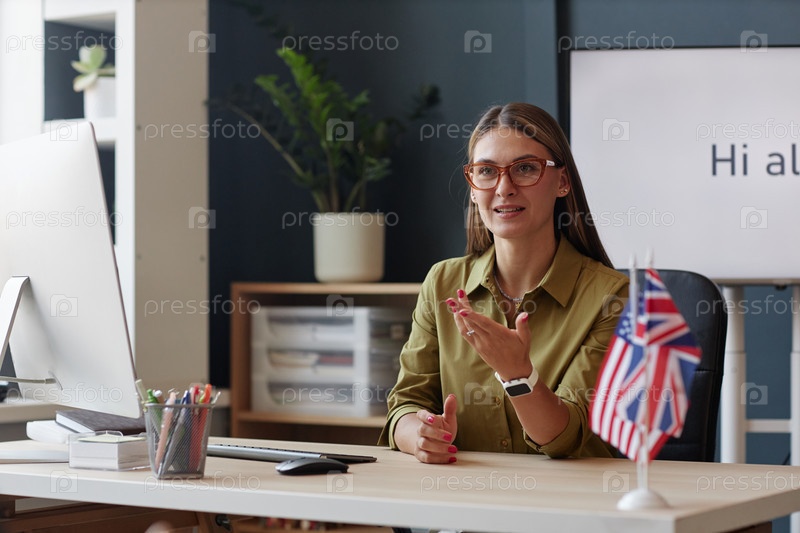 Улыбающаяся молодая женщина преподает студентам, сидя за столом в классе языкового курса