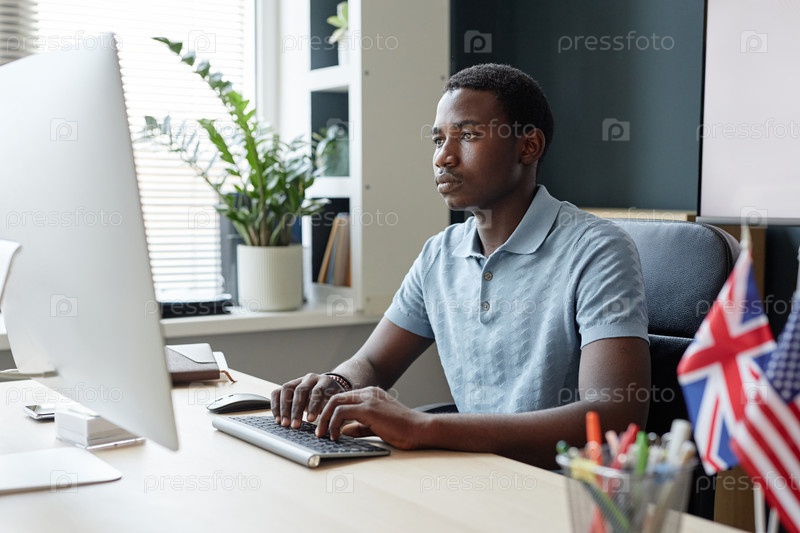 Молодой чернокожий мужчина использует компьютер для учебы или работы в классе английской школы