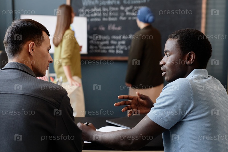 Молодой чернокожий мужчина разговаривает с другом Практикуется говорить на уроке английского
